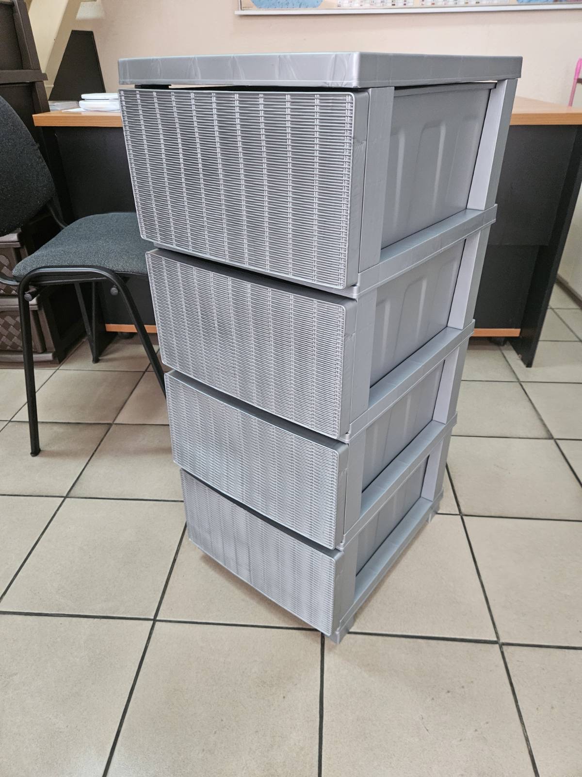 Пластиковий комод "Ротанг" виготовлений із якісного вторинного пластику та має 4 шухляди. Цей комод може використовуватися для зберігання будь-яких побутових дрібниць, одягу, взуття, іграшок, інструменту тощо. Комоди з пластику можна використовувати у ванні або душовій або навіть на вулиці, адже пластикові комоди не бояться вологи.