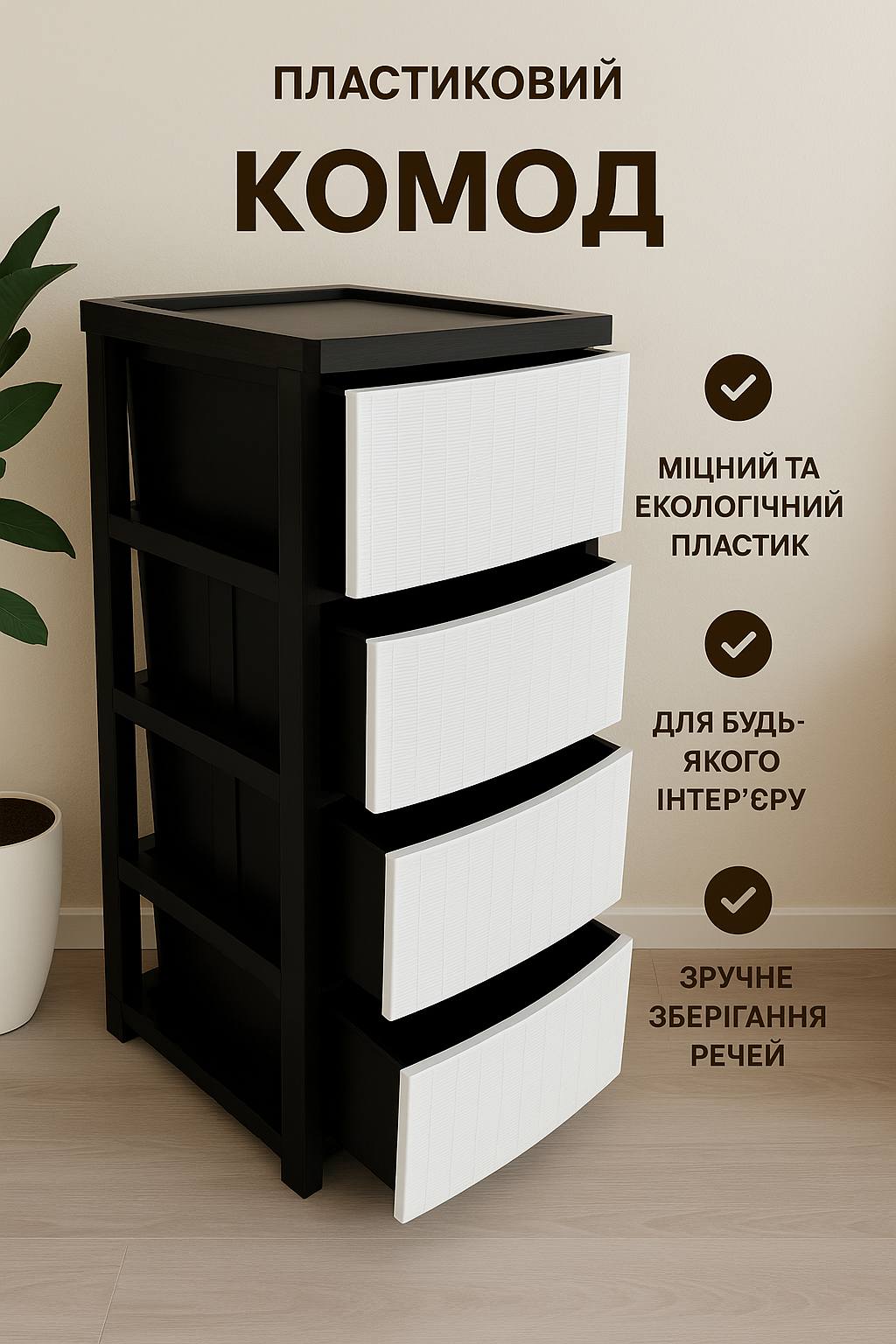 Пригоди цього пластикового комода — недорога ціна, сучасний і елегантний зовнішній вигляд, простота у використанні.